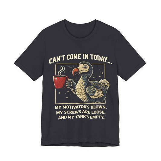 Dodo Bird Humor Tee – "Can't Come In Today... My Motivator's Blown" Graphic T-Shirt