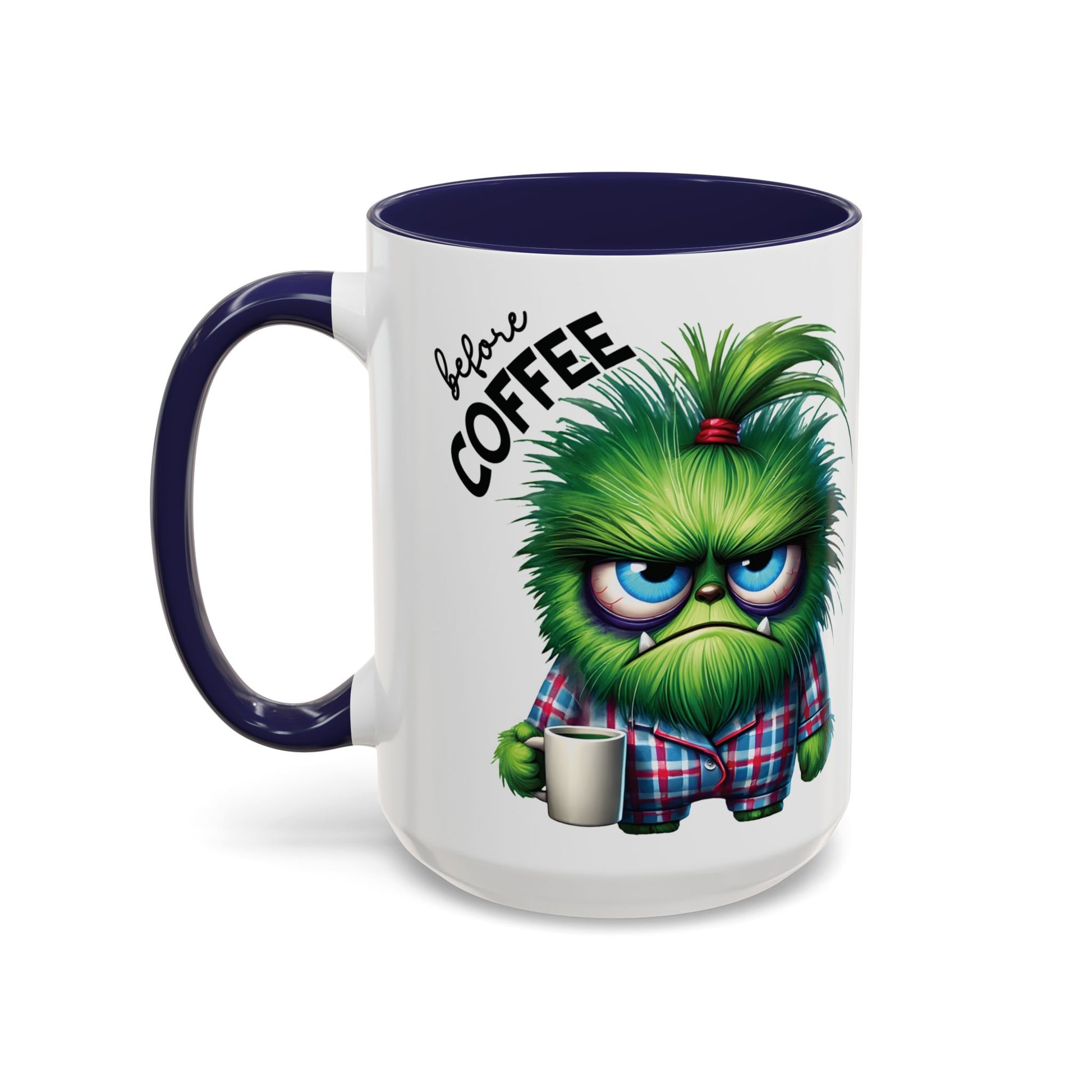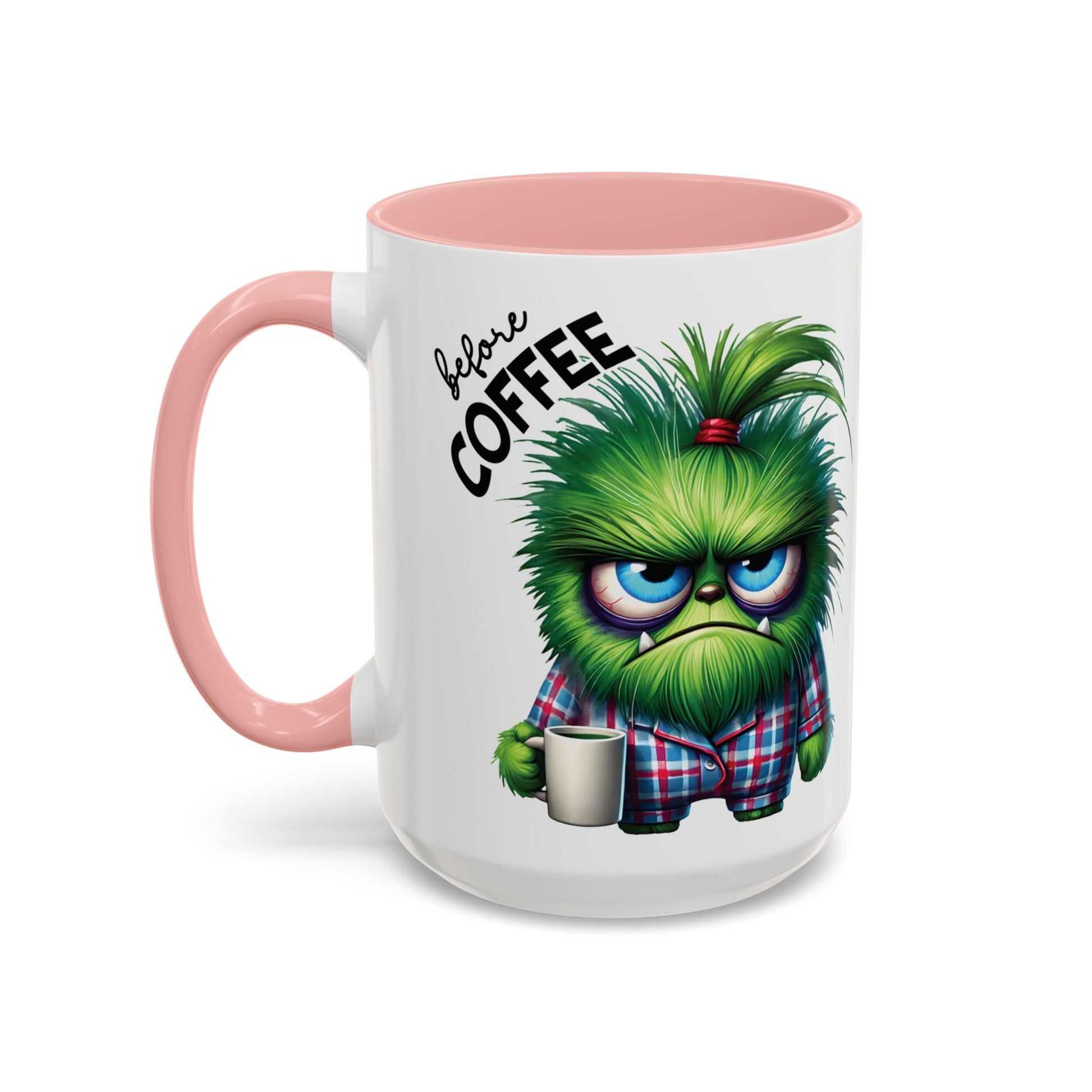 Coffee mug featuring a design of an angry monster before caffeine and a happy monster after caffeine. Perfect for starting the day with a smile. Ideal for coffee lovers and those who enjoy a good laugh. Great for gifting on birthdays, holidays, or just to brighten someone's day.